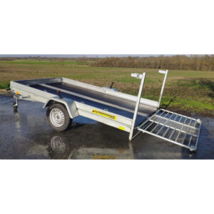 Remolque de 2 ejes con una superficie de transporte de 304 x 153 cm. Peso bruto vehicular (MMV) de 400 a 750 kg. Dos ejes sin frenos. Totalmente galvanizado.