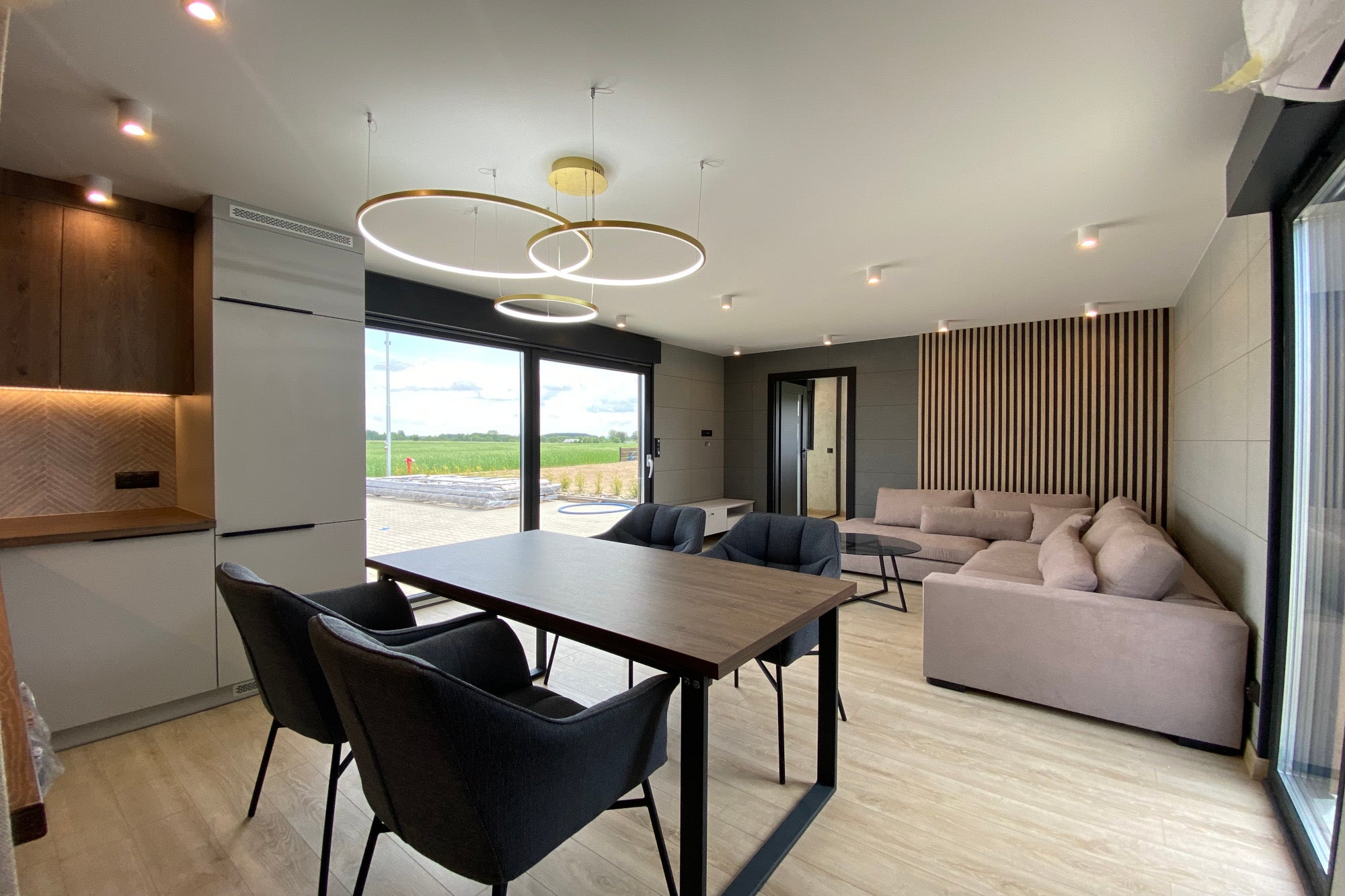 Cocina equipada que da a un amplio salón.