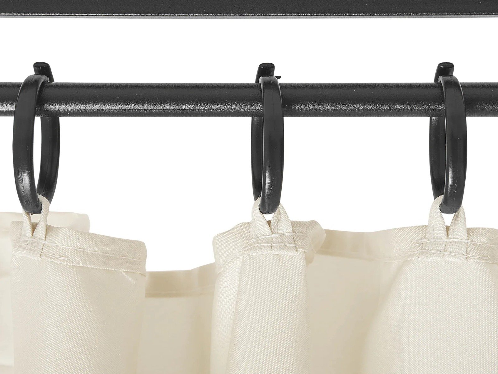 Estructura estable de acero con recubrimiento en polvo en negro. Incluye 6 cortinas beige con lazos para mayor privacidad y protección, además de un doble techo para excelente circulación de aire. Toldo con protección UV UPF 30+. Se instala fácilmente sin cimientos.