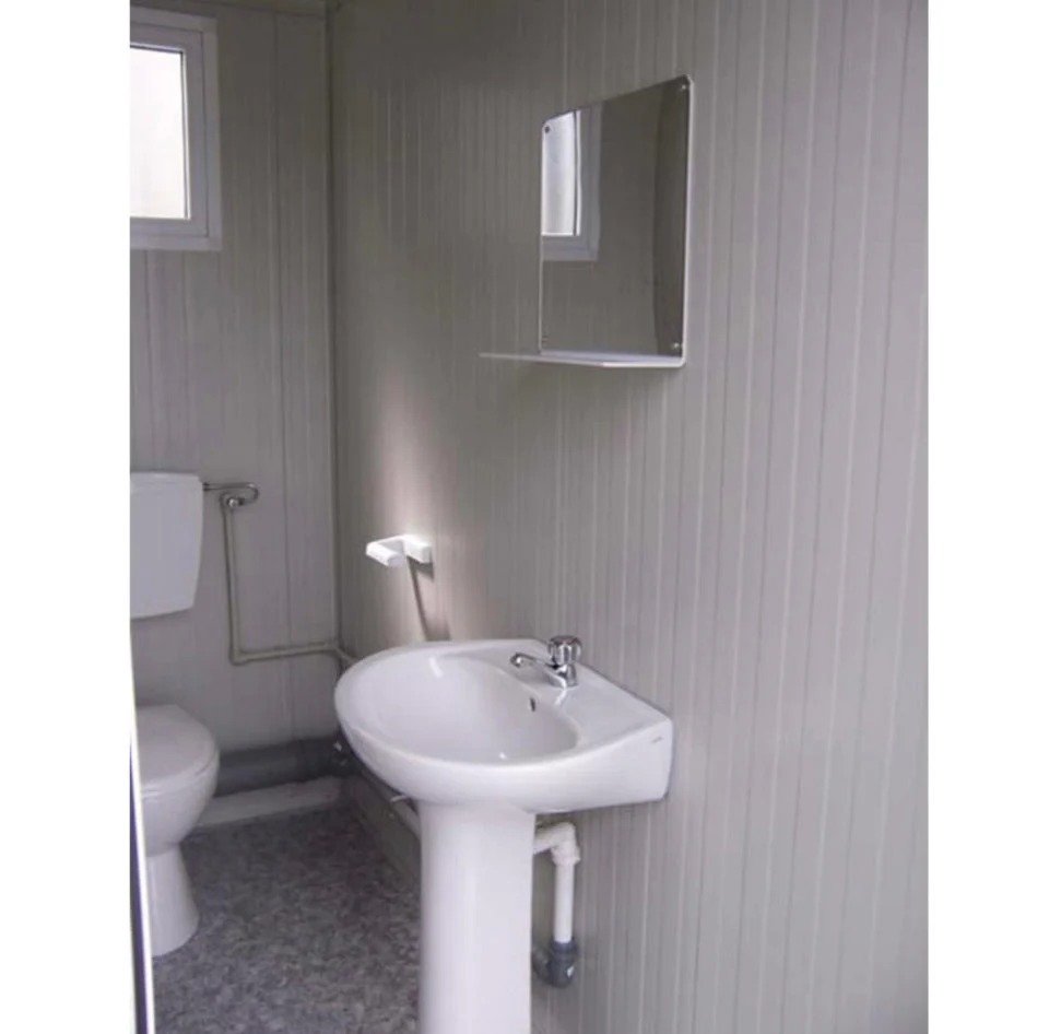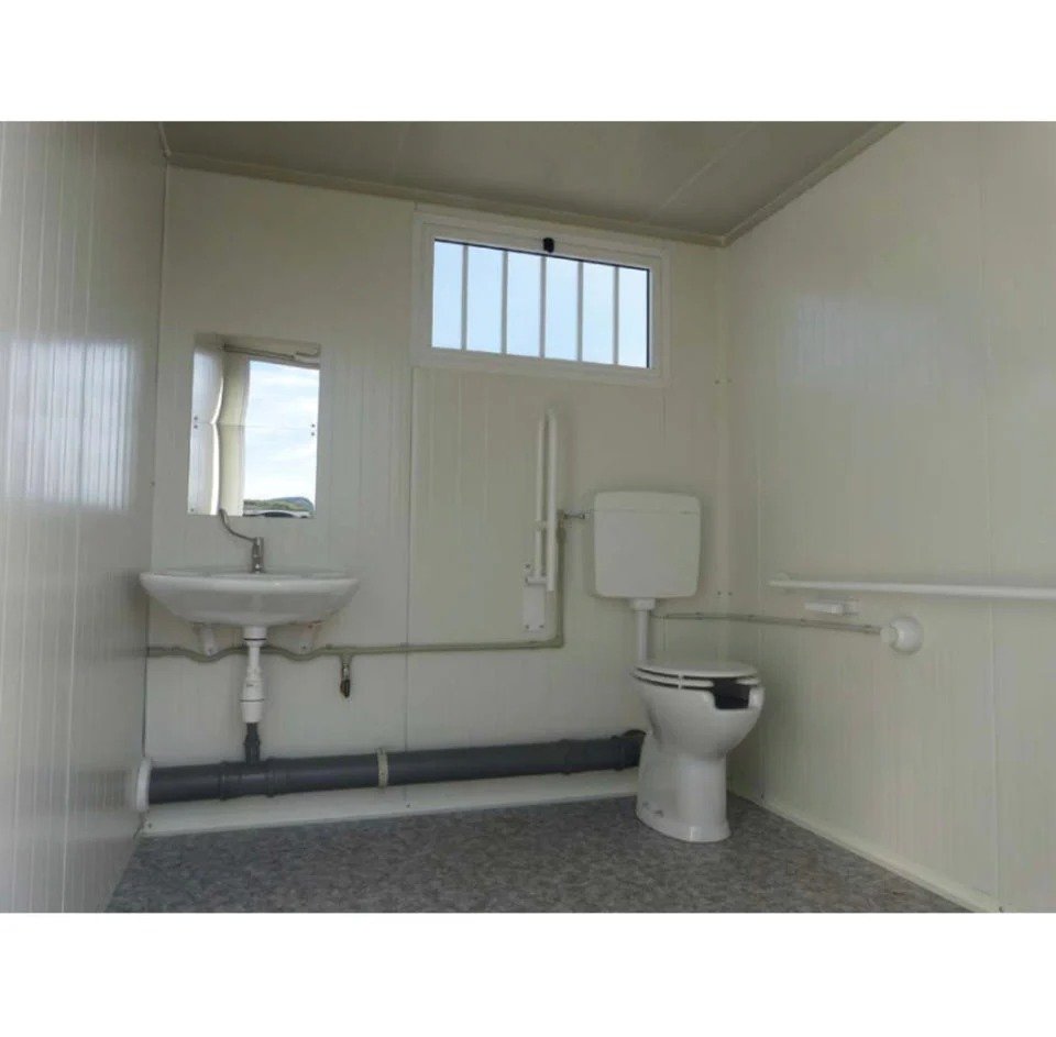 La estructura cuenta con una sección dedicada a PMR, equipada con un inodoro y un lavabo adaptados, ambos con la grifería necesaria para su fácil uso. También incluye un inodoro y lavabo estándar para el público general. Fabricado con una estructura de acero galvanizado y lacado, está diseñado para un manejo sencillo.