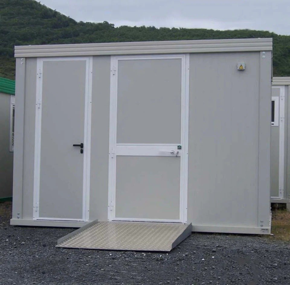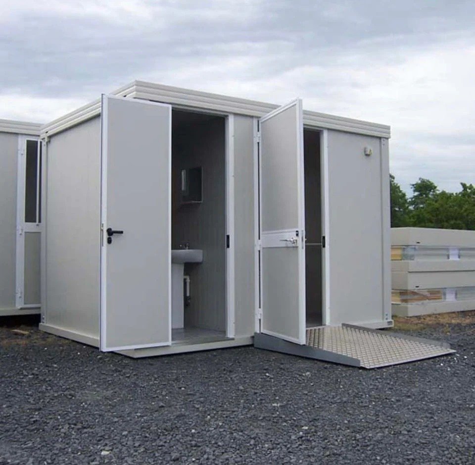 Este módulo sanitario es la opción ideal para cualquier espacio que necesite instalaciones accesibles para personas con movilidad reducida (PMR) y servicios estándar. Su diseño robusto y funcional lo convierte en una solución versátil y duradera para eventos, obras o espacios públicos.