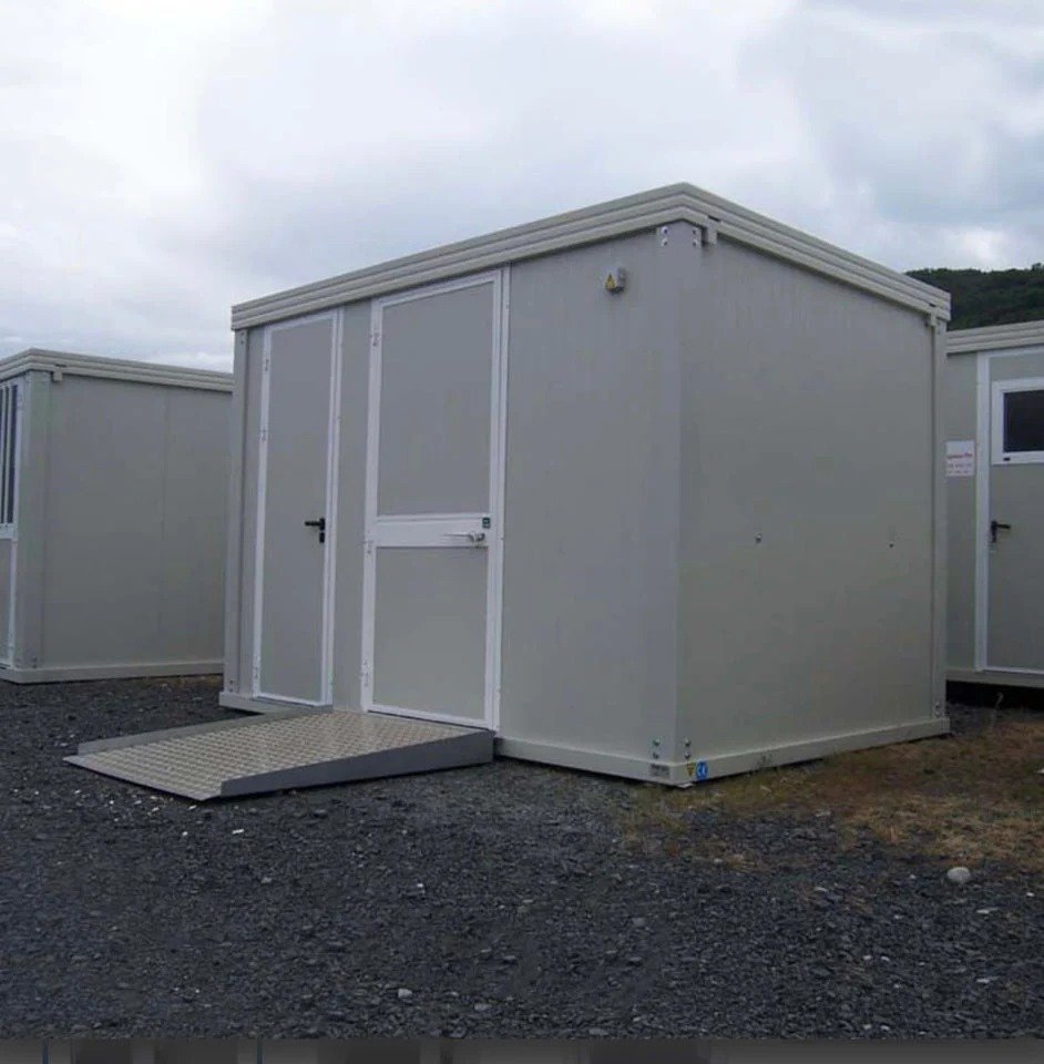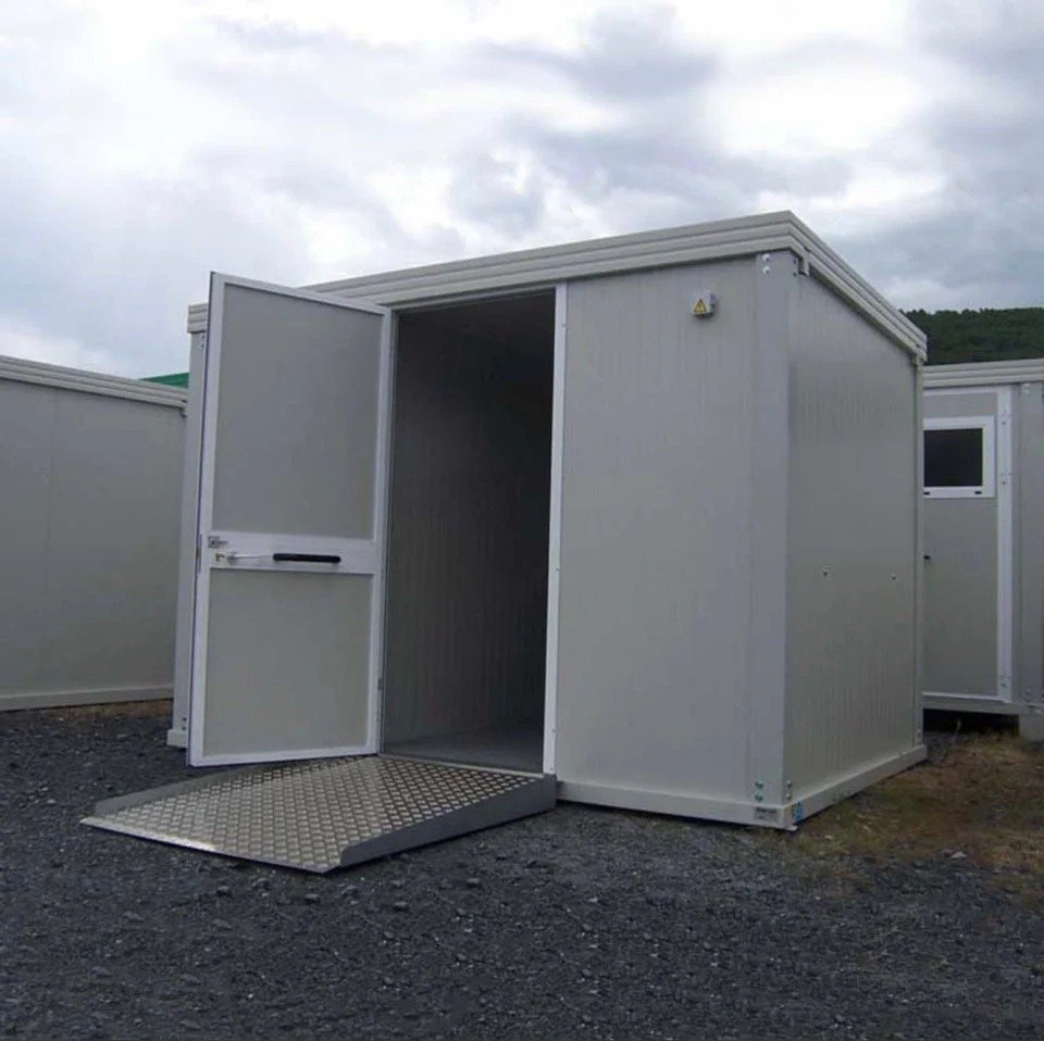 Las paredes y el techo, hechos de paneles sándwich de 40 mm y 30 mm, respectivamente, ofrecen un excelente aislamiento. El piso, de madera y cemento con revestimiento de PVC, garantiza una superficie robusta y fácil de limpiar.