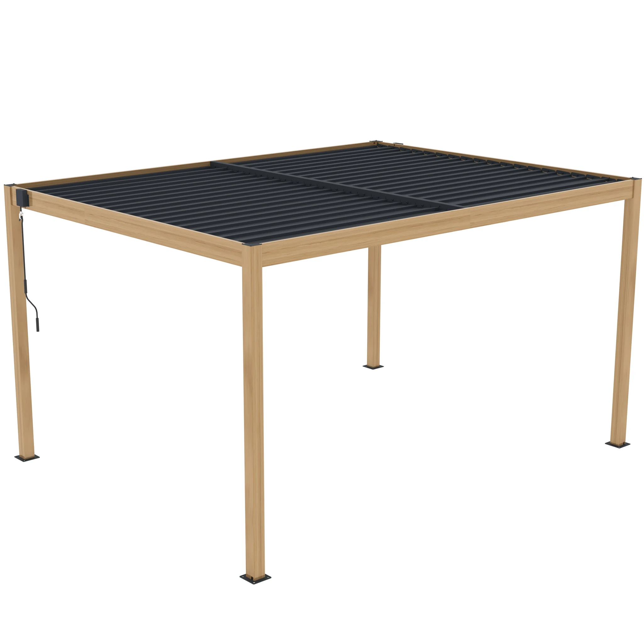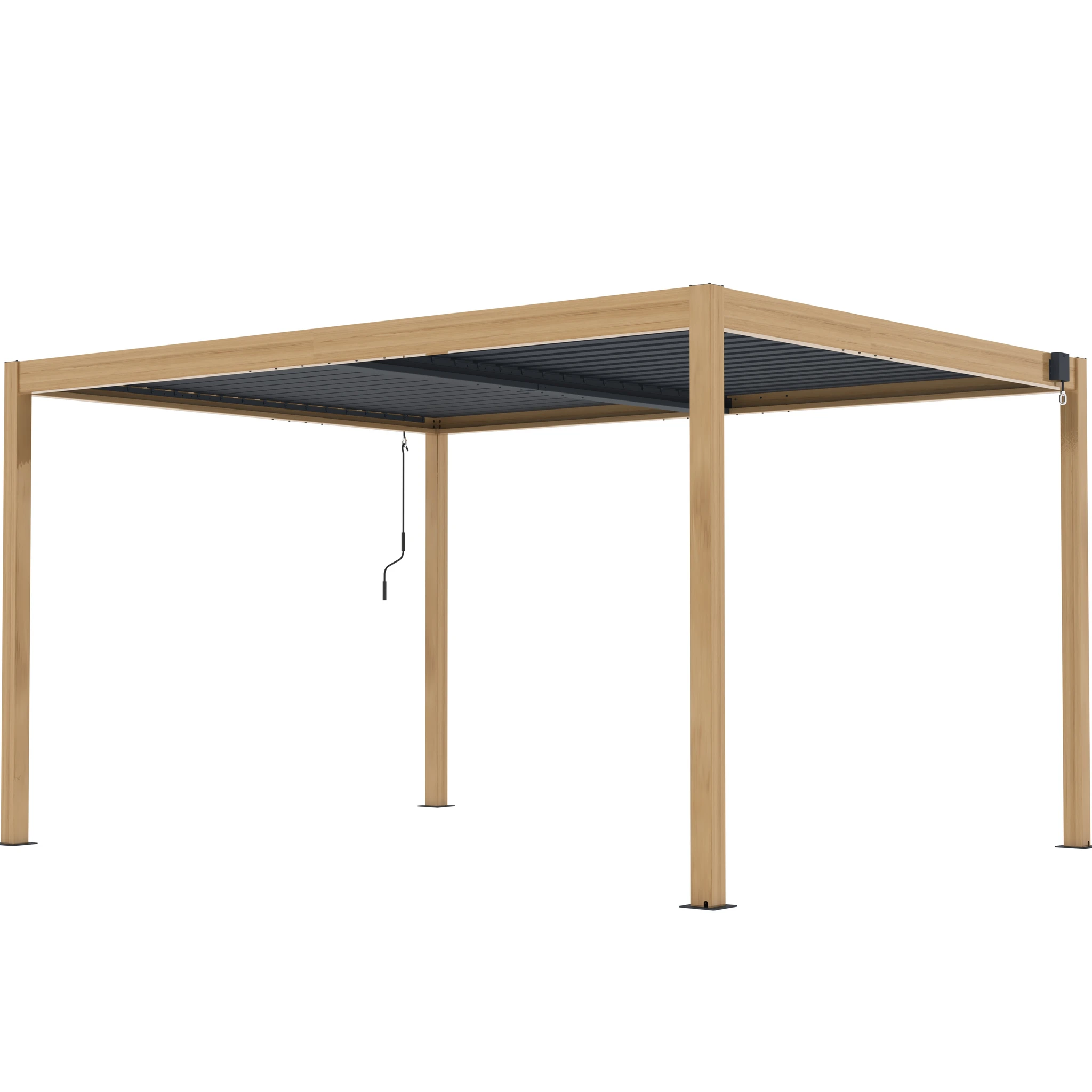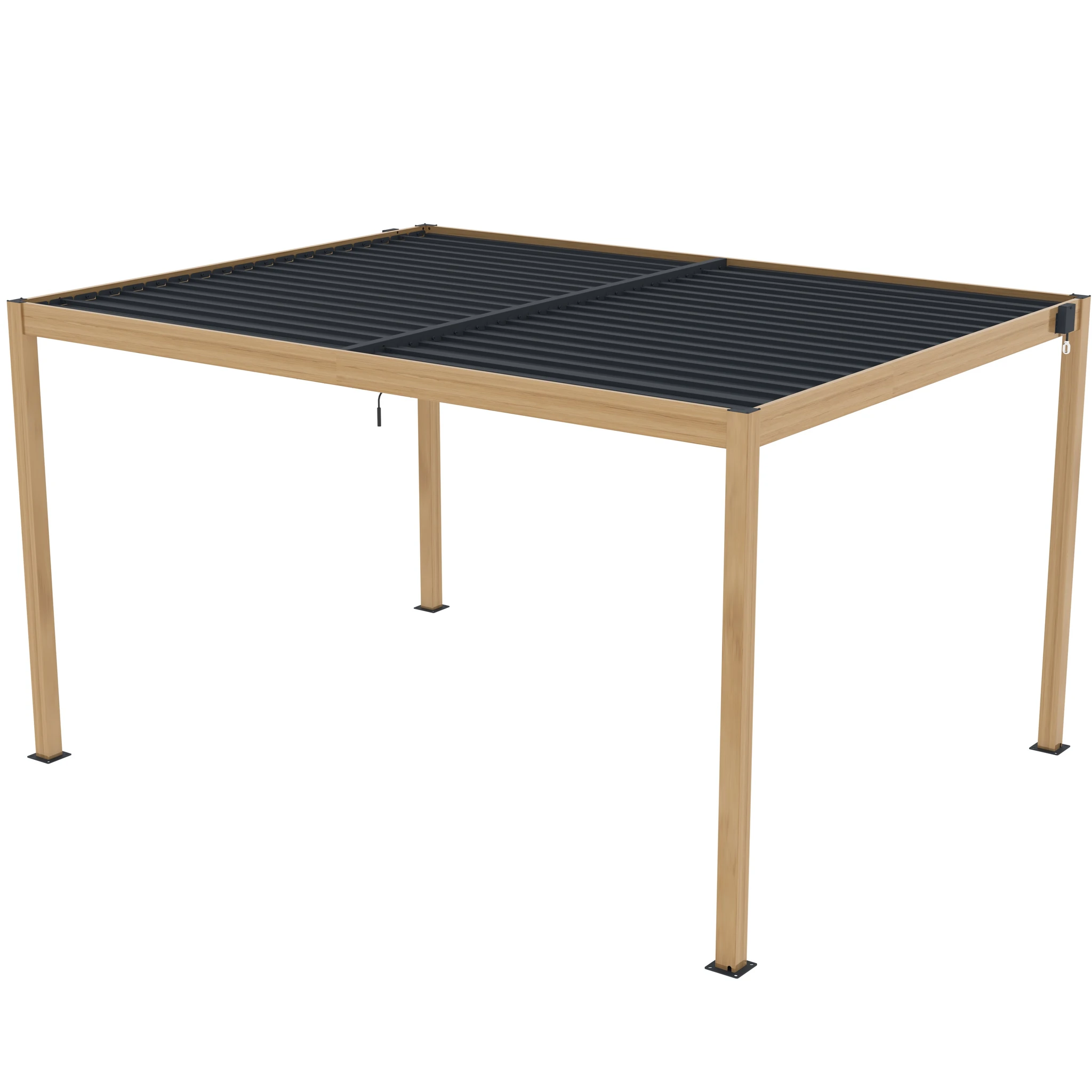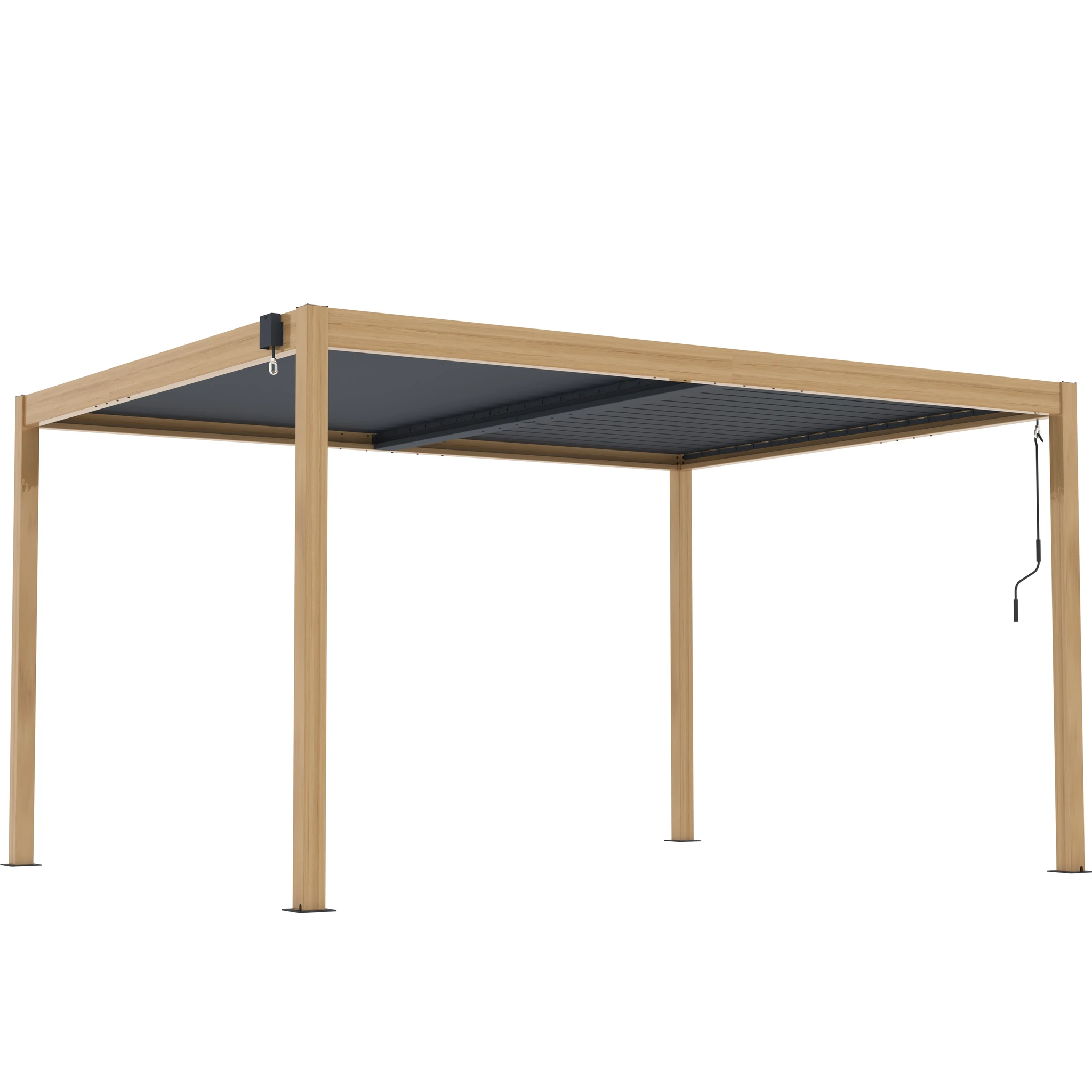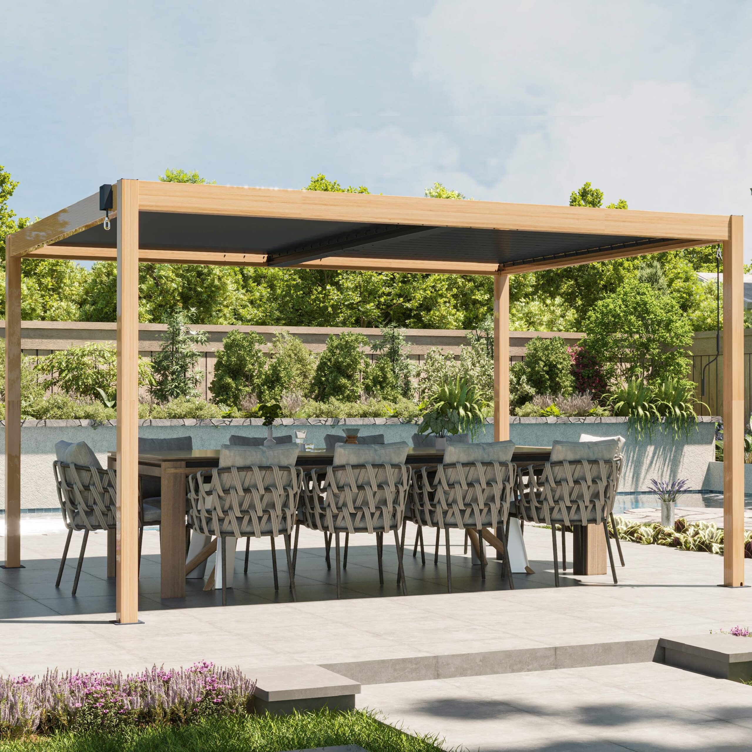 Una de sus principales funciones es su techo ajustable, que permite controlar la cantidad de sombra y ventilación. Las lamas pueden rotar de 0° a 110° mediante una manivela, brindándole flexibilidad para dejar entrar tanta o tan poca luz solar como desee. Esta pérgola está diseñada con un sistema de drenaje de flujo libre, por lo tanto, no pasará el agua cuando el techo esté cerrado (totalmente impermeable).