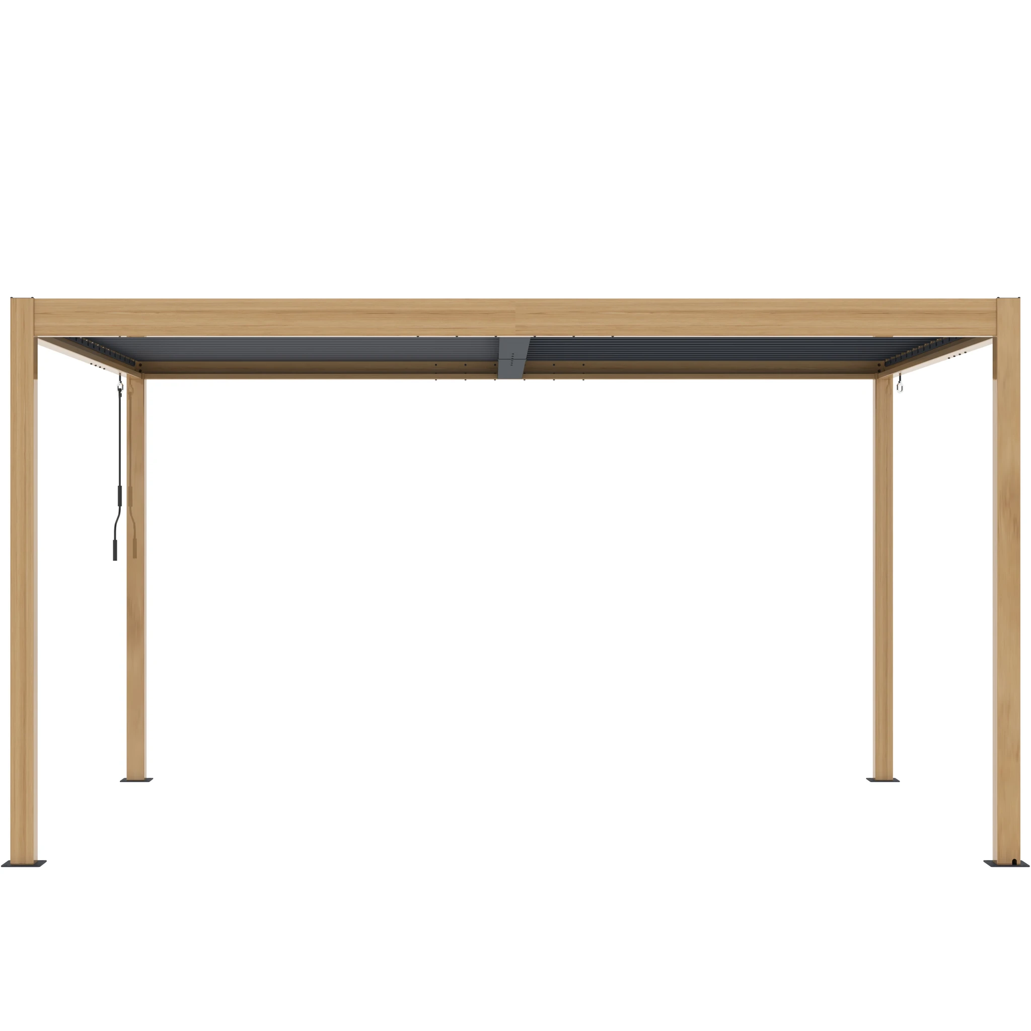 Esta pérgola NO es de madera (es de acero galvanizado y aluminio); está acabada en color madera de altísima calidad, resistente y duradera durante muchos años.